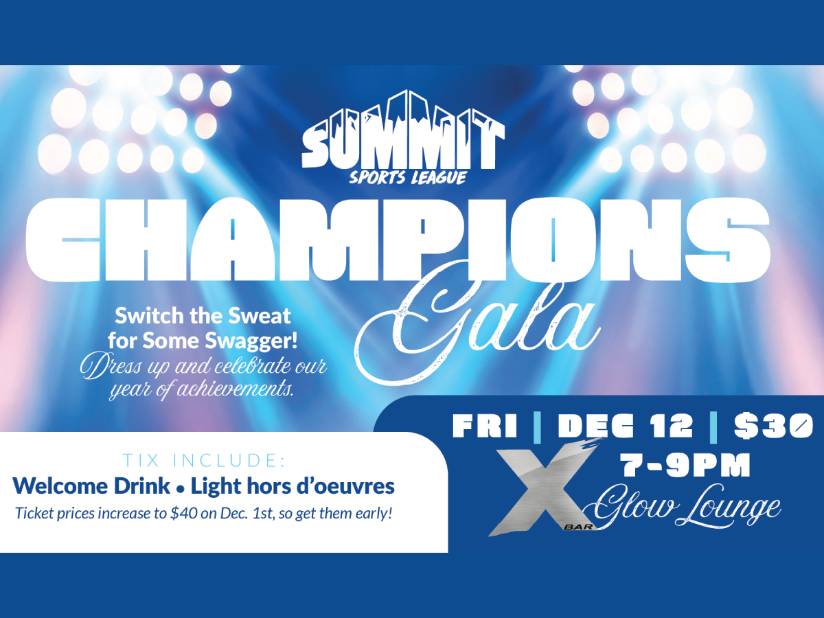 X Bar Glow LoungeJoin Summit Sports League at our Inaugural Champions Gala at the X Bar Glow Lounge. Switch the sweat for some swagger — dress up and celebrate our year of achievements! Tickets are $30 until December 1st and go up to $40 after that. Tickets include a welcome drink and light hors d'oeuvres. So, dress to the nines and let's have a fun evening celebrating our community!